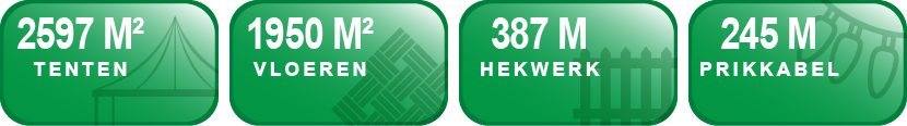 Met 65 Pagodetenten, 1086 m² Alu-hal, 171 m² luifels en 2 stretchtenten is er meer dan genoeg ruimte voor alle bezoekers en de standhouders. 1950 m² cassettevloer zorgt ervoor dat al deze mensen geen vieze schoenen krijgen en 387 m hekwerk zorgt ervoor dat de Koewei netjes afgesloten kan worden. 245 m prikkabel en de bijhorende 327 lampjes zorgen tenslotte voor een gezellige festivalsfeer. Dit alles (en meer) is in 26 ritten naar de Koewei gebracht!